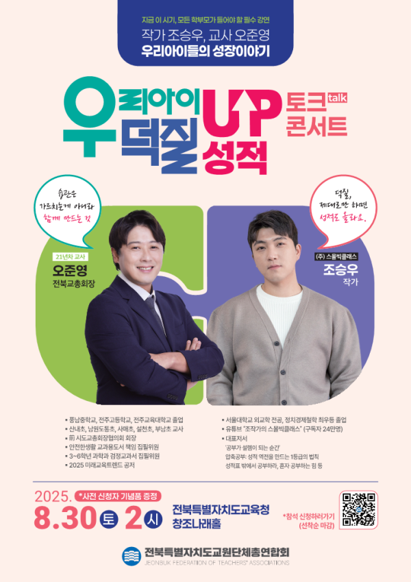 이번 토크콘서트는 ‘공부가 설렘이 되는 순간’ 저자 조승우 작가와 21년차 교사이자 전북교총의 오준영 회장이 함께 무대에 오를 예정이다.